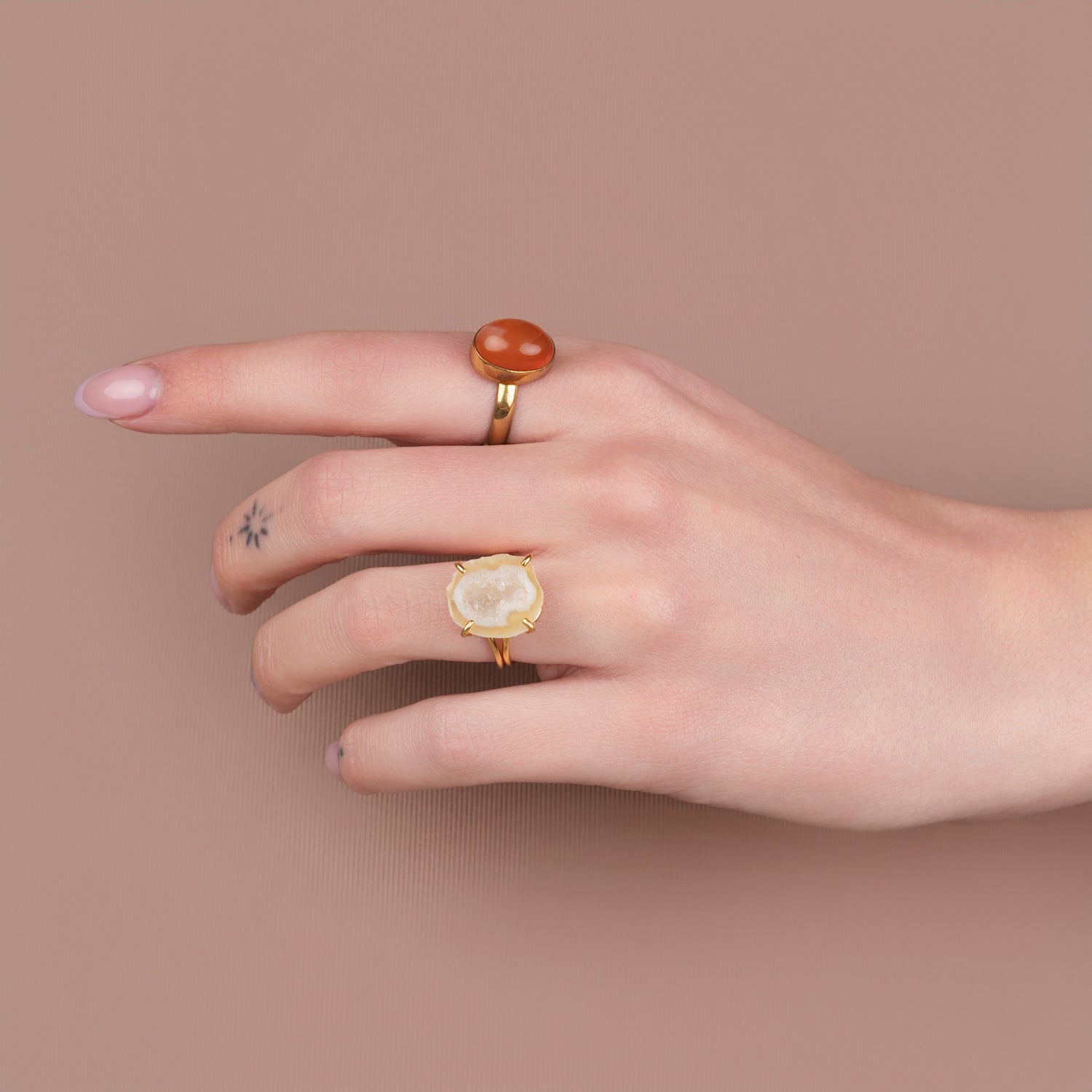 Iedere geode ring is one-of-a-kind door haar natuurlijke vorm en unieke patronen. Geen twee stenen zijn hetzelfde, waardoor je een sieraad draagt dat écht alleen van jou is. Omdat iedere steen uniek is, is er van elk sieraad maar één beschikbaar — uitverkocht is dus ook écht uitverkocht.